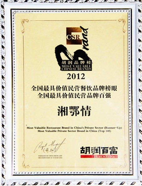 胡潤研究院近日發(fā)布《2012中國民營企業(yè)品牌排行榜》暨《2012胡潤品牌榜》,榜單對100個中國最有價值品牌按照其品牌價值進行排名。今天記者從湘鄂情集團獲悉,其昨天剛剛拿到2012全國最具價值民營餐飲品牌榜眼的證書。