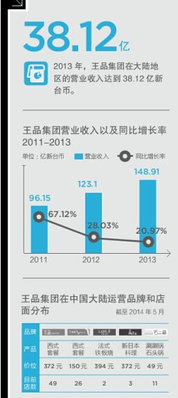 據(jù)王品集團(tuán)的財(cái)報(bào), 2013財(cái)年,其在大陸的品牌門店?duì)I收達(dá)到7.7億元,較2012年的5.6億元相比,增長37.5%。
