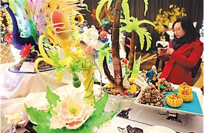 除了特色菜品外,本屆APEC會(huì)議餐飲的擺臺(tái)也將成為一次“文化盛宴”,老北京四合院及影壁墻、百鳥朝鳳、孔雀迎賓、八仙過(guò)海等中國(guó)元素,將作 為裝飾出現(xiàn)在會(huì)議餐桌上。據(jù)相關(guān)負(fù)責(zé)人介紹,屆時(shí)將有8組不同風(fēng)格的裝飾將點(diǎn)亮餐桌,通過(guò)糖雕、果蔬雕、面塑等各種食品雕塑來(lái)體現(xiàn)中國(guó)文化。其中很多擺臺(tái) 更是直接以北京民俗為主題,比如老北京四合院及影壁、天壇、糖葫蘆群像、石獅子……